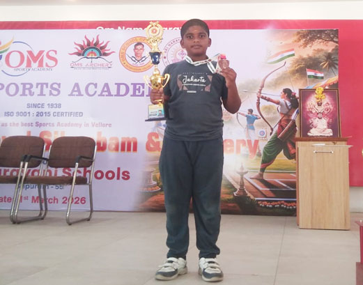 Saantha Rubhan M of Class 6C participated in the State Level Silambam Championship under the Sub-Junior (11–12 years) category and secured Third Place in the ‘Ottrai Kambu Veechu’ event.