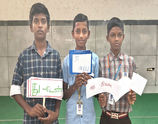 தமிழ்மொழி வாழ்த்துபாடலைப்பாடுதல். ஒரு சொல்லுக்கு இரண்டுப்பொருள் கூறும் இரட்டுறமொழிதலை விளக்கிக்கூறுதல்